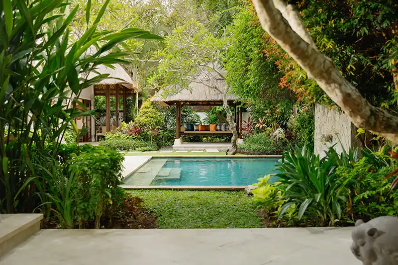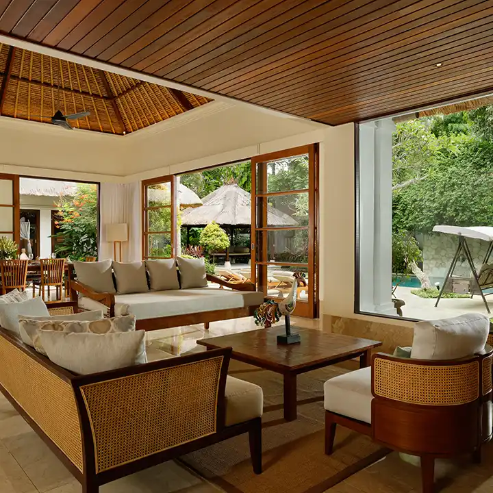 This elegant villa boasts four spacious bedrooms with private ensuite bathrooms, making it the perfect getaway for families, friends, or couples seeking privacy. The open-plan living and dining areas are tastefully decorated with a blend of contemporary and traditional Balinese furnishings, creating a warm and inviting atmosphere. The garden area of Villa Ohm is lush, tranquil, inviting and also the gazebo under a canopy of trees provides a perfect spot to relax.